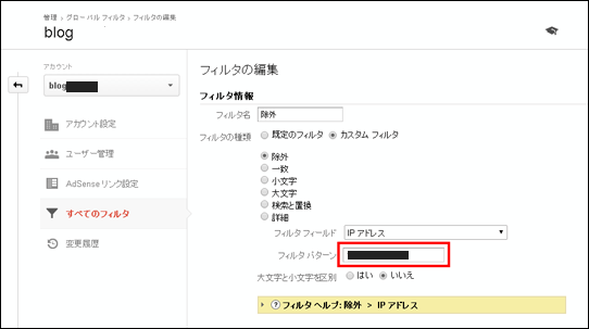 やり方は非常に簡単で、GoogleAnalytics→アナりティクスの設定→すべてのフィルタを選択します。そうすると、以下のような画面が出てきますで、フィルタパターンの箇所(赤枠で囲った部分)に自己PCのグローバルIPアドレスを入力すれば終了です。